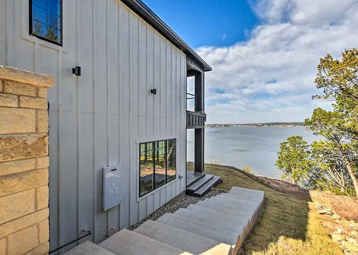 Willkommen im Luxury Lake Granbury Cliffside Home With Deck!, Einem wahren Rückzugsort für Naturliebhaber und Erholungssuchende. Eingebettet in die malerische Landschaft von Granbury, Texas, bietet diese Unterkunft atemberaubende Ausblicke auf den See und die umliegenden Hügel.